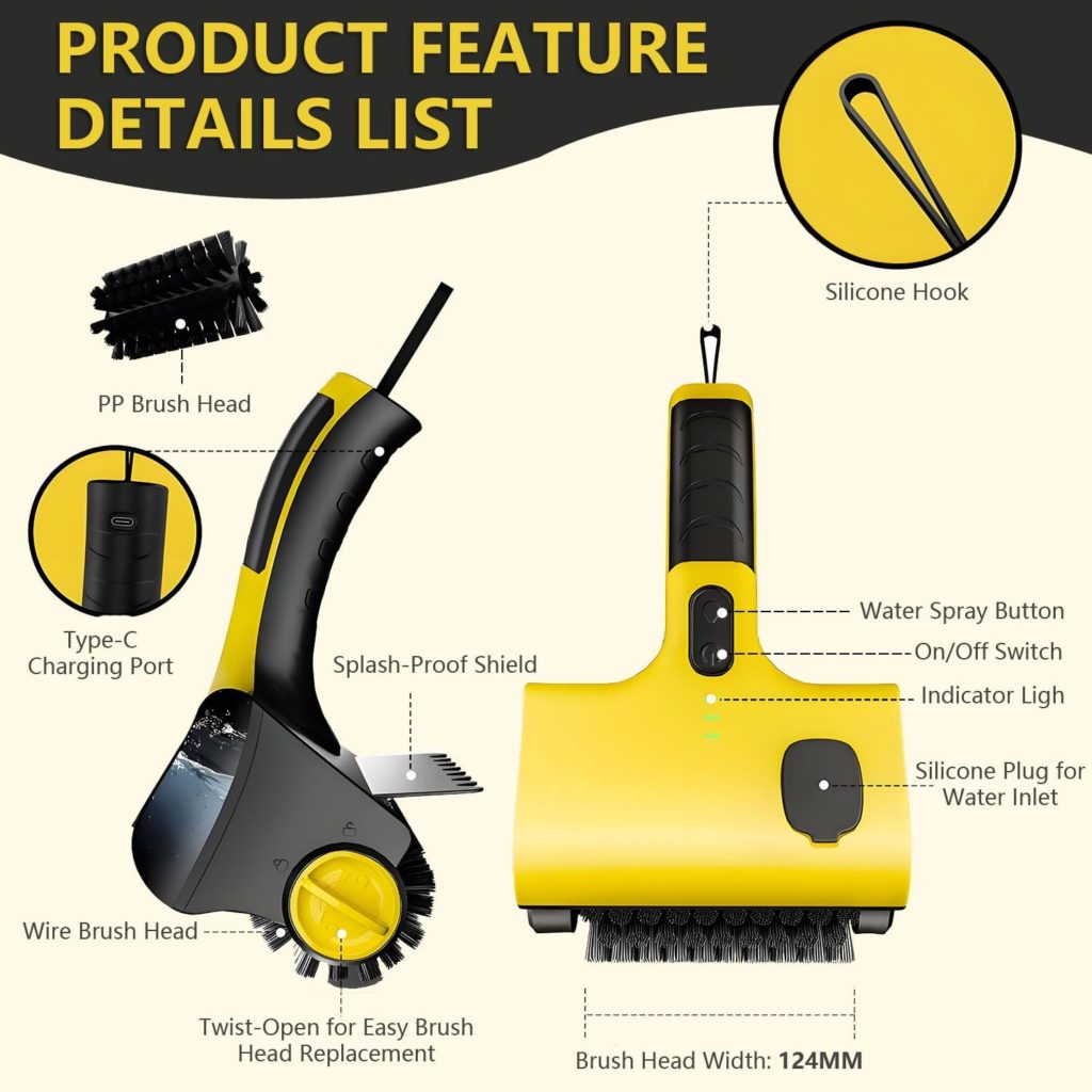 (User-Friendly) Humanized design, simple and easy to use. This outdoor grill cleaning brush features an ergonomically designed handle that reduces wrist strain by 55% during extended use. Its one-touch design allows for simple power on, speed adjustment, and water delivery. It is also equipped with an LED power indicator light, so the power level is clear. Multiple designs integrated into one, giving you an easy and comfortable cleaning experience.