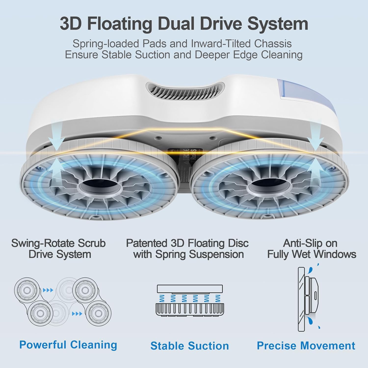 (Strong, Stable Grip with Edge Precision) Equipped with spring-loaded pads and an inward-tilted triangular chassis, the S7 ensures stronger edge contact and 20% faster cleaning. It maintains stable suction—even on wet or framed windows.